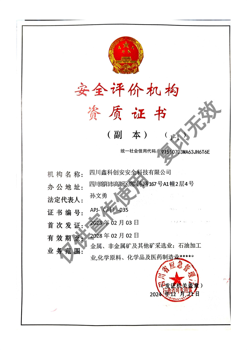 四川鑫科創(chuàng)安安全科技有限公司成立于2020年,是川北地區(qū)取得資質(zhì)的民營安全評價(jià)機(jī)構(gòu)(資質(zhì)證書編號:APJ-(川)-035)。并于2022年?duì)款^成立綜合應(yīng)急救援隊(duì)伍 - 綿陽曙光應(yīng)急救援中心。